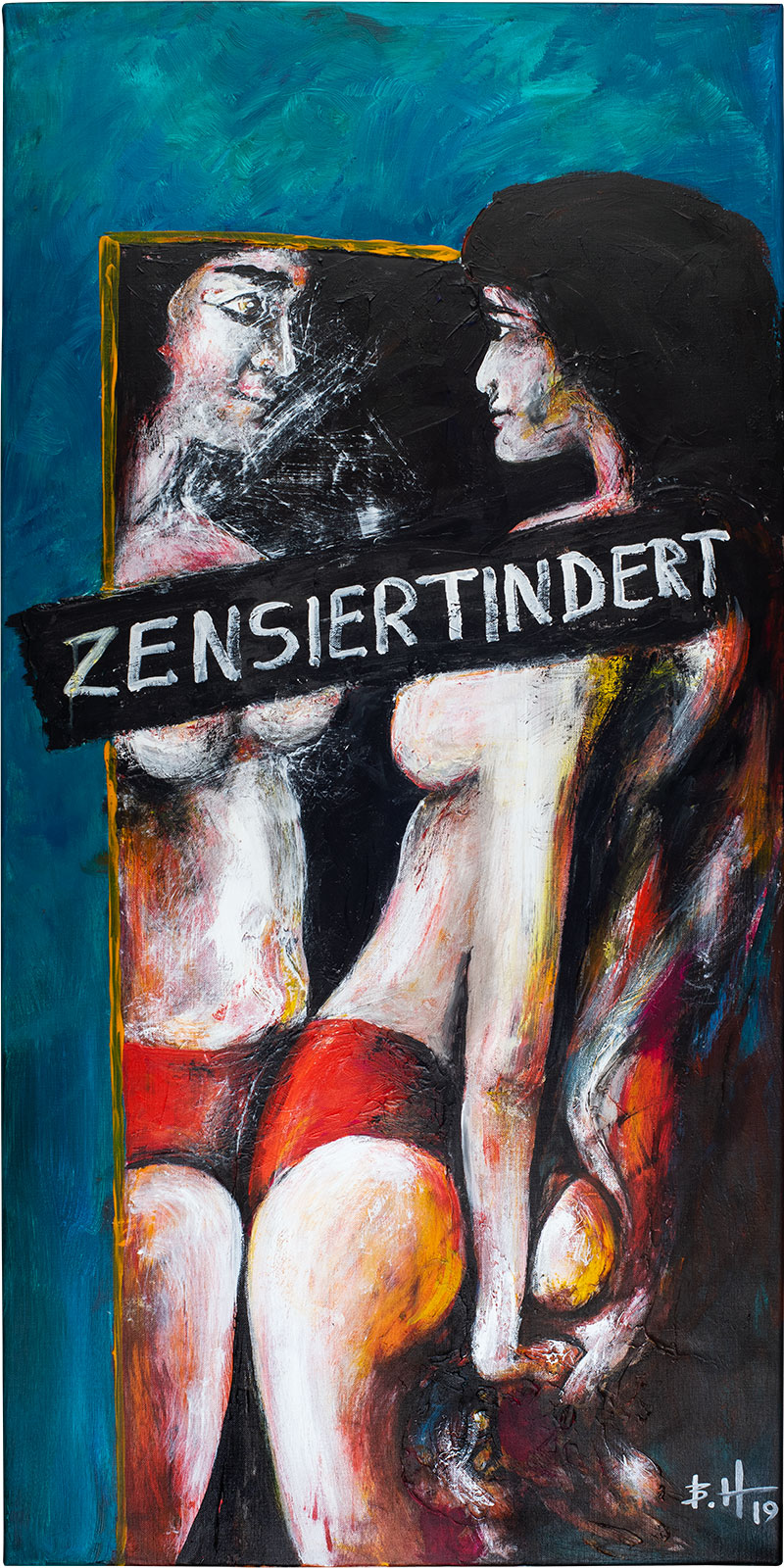 will raus mit seinem Kopf. Schreit die Welt mit Farbe an, tunkt Politik und die Gesellschaft in Hirn und hängt ihr den Spiegel vor’s Gesicht. Nimmt, was ihm nicht passt und passt es ein in die Paletten, Leinwände, Vorwurf, Häme, Großformat. Hat keine Lust, zu erklären, will, dass gedacht wird, aber Rätsel aufgeben liegt ihm fern, denn Rätsel ist die Welt genug.